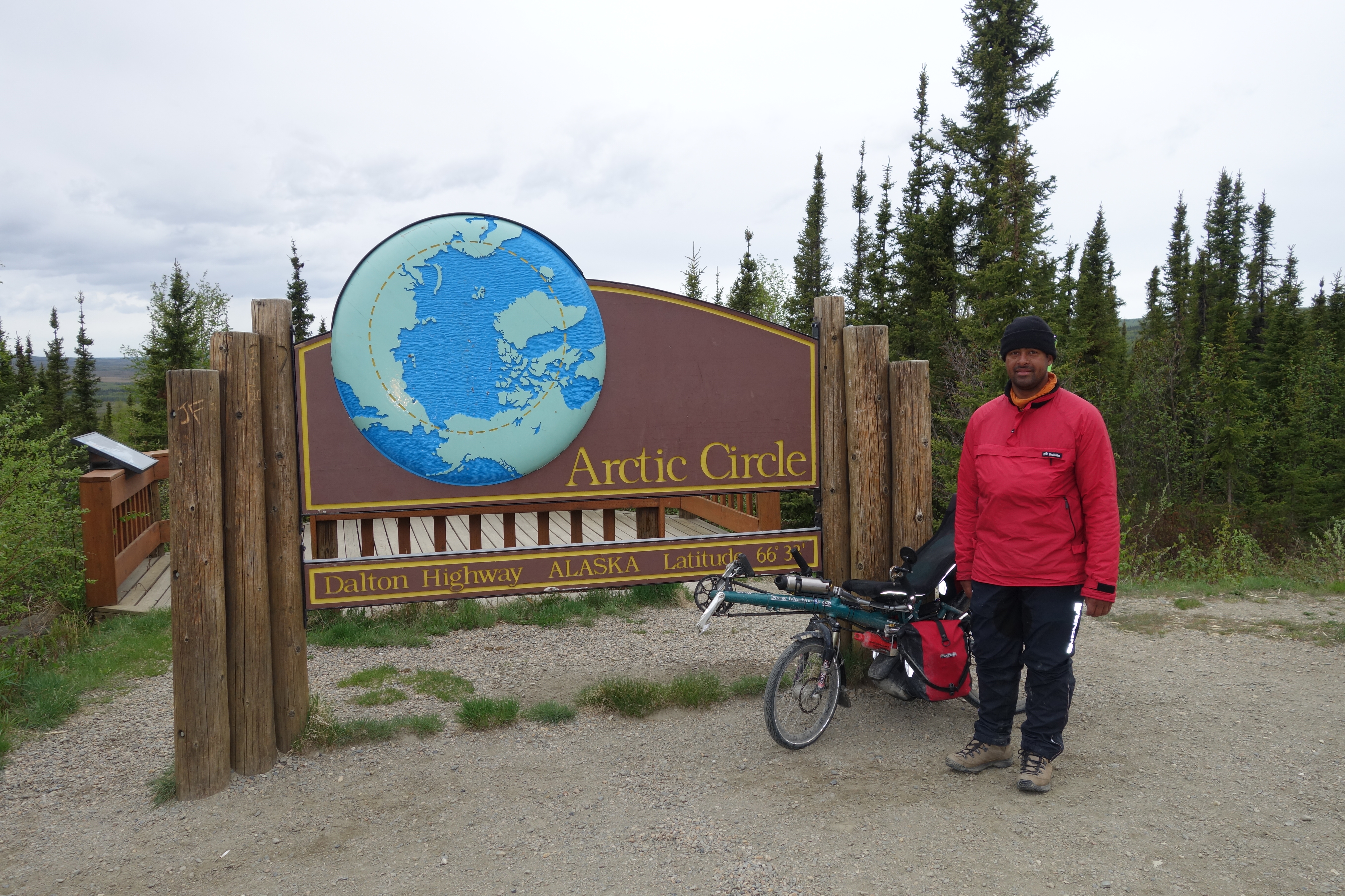 Arctic circle 66º 33' north. The point where the sun stops doing funny things in the sky and finally begins to set properly. Its a tourist area, so lots of toilets, picnic tables, car parking, graffiti and possible bears looking for a free meal. But the obligatory photos are a must. There is even a certificate you can write yourself. However this is only available from the visitor centre at Coldfoot 50 miles up the road!