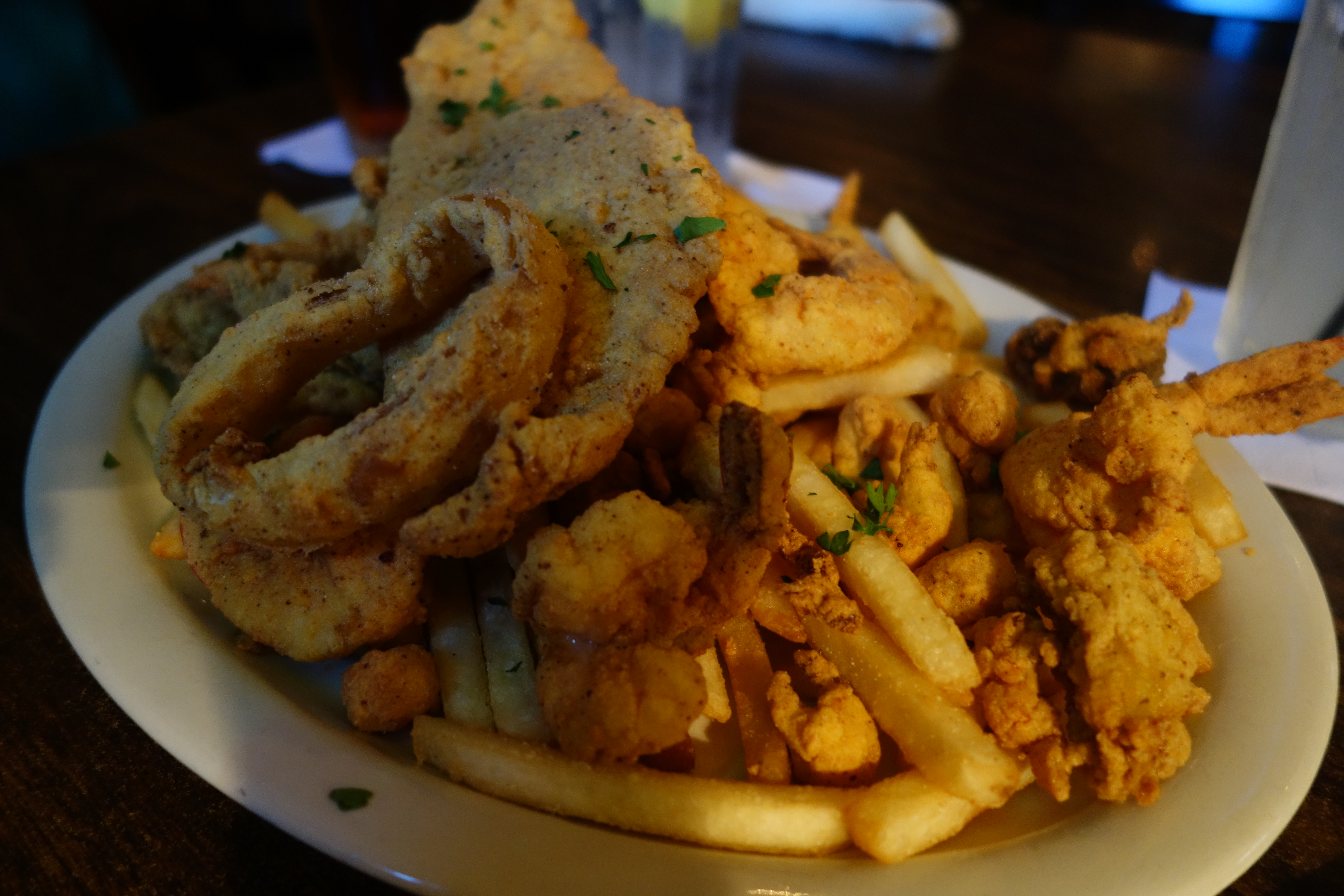 Fish and chips Cajun style (and shrimp, oyster, onions, and catfish)