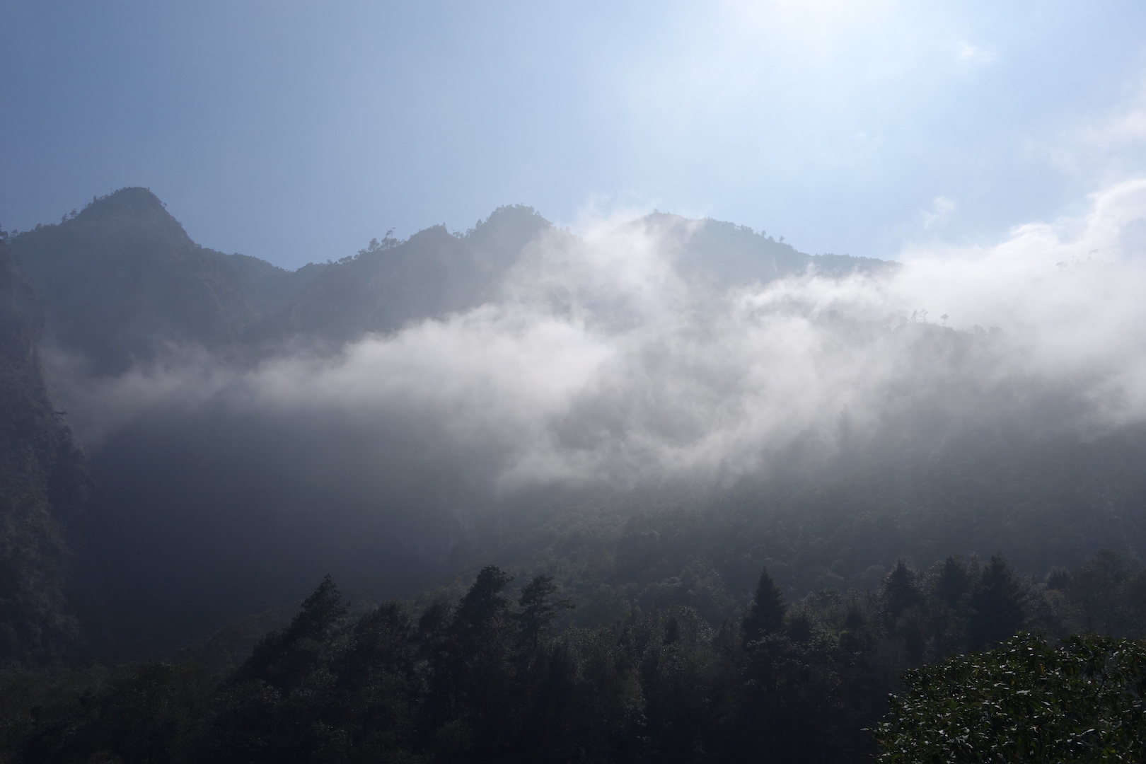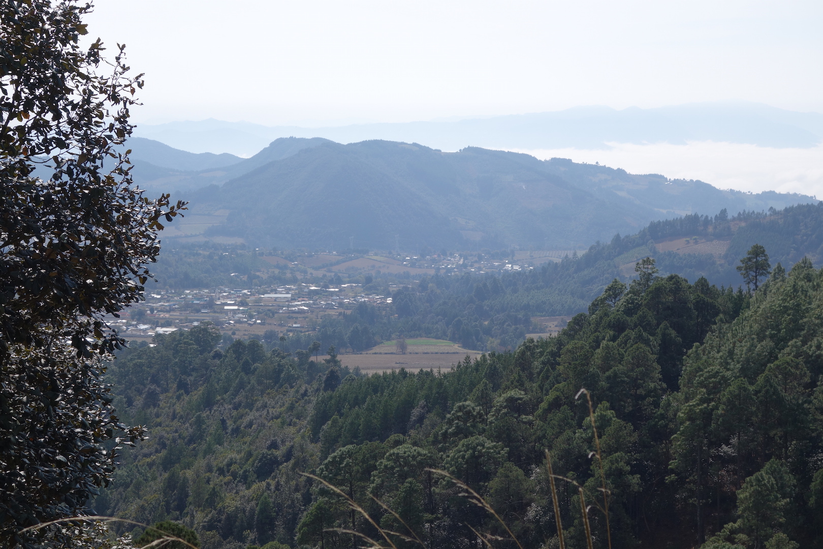 Descending into the Orizaba valley the wind died down, but the thick cloud we could see in the valley below cooled the air quickly. Moist droplets stuck to every surface as we decended.