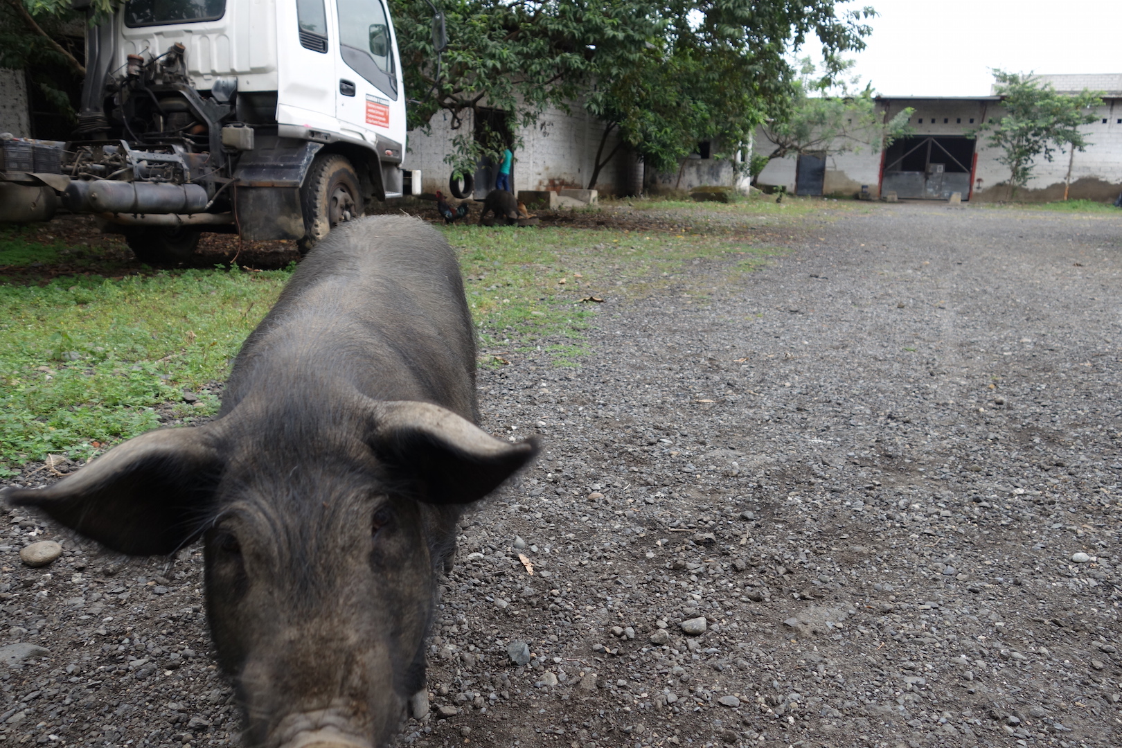 You often sleep in some strange places, but I have never slept in in a vacant car garage with 2 curious pigs and a hyperactive dog.
