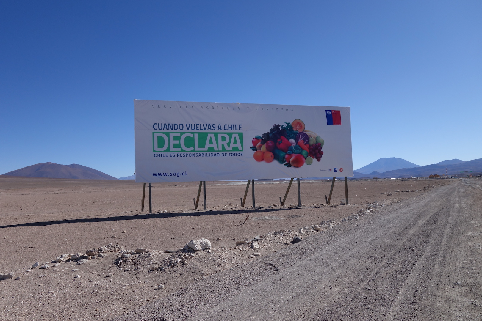 A poster in the no man's land had advertised the "Don't bring fresh foods into Chile" disease prevention campaign, so it wasn't unexpected, and I was unsure as to whether a sliced tomato in a chicken sandwich I was carrying would count?