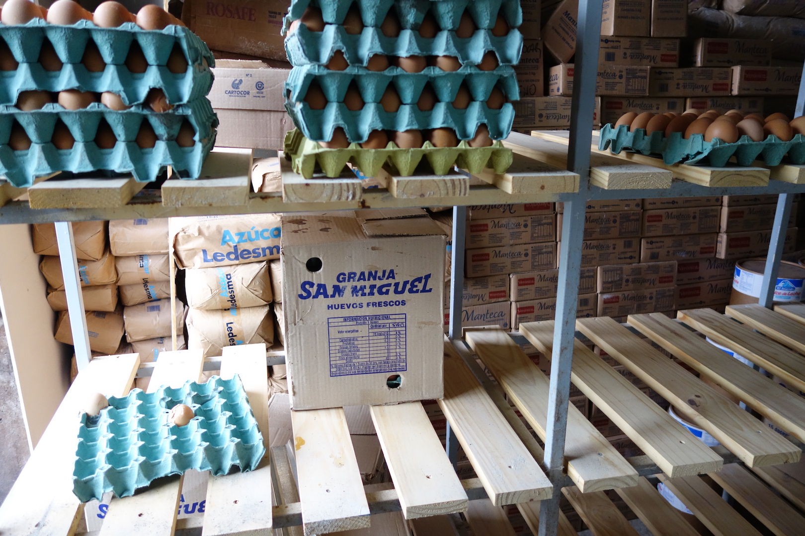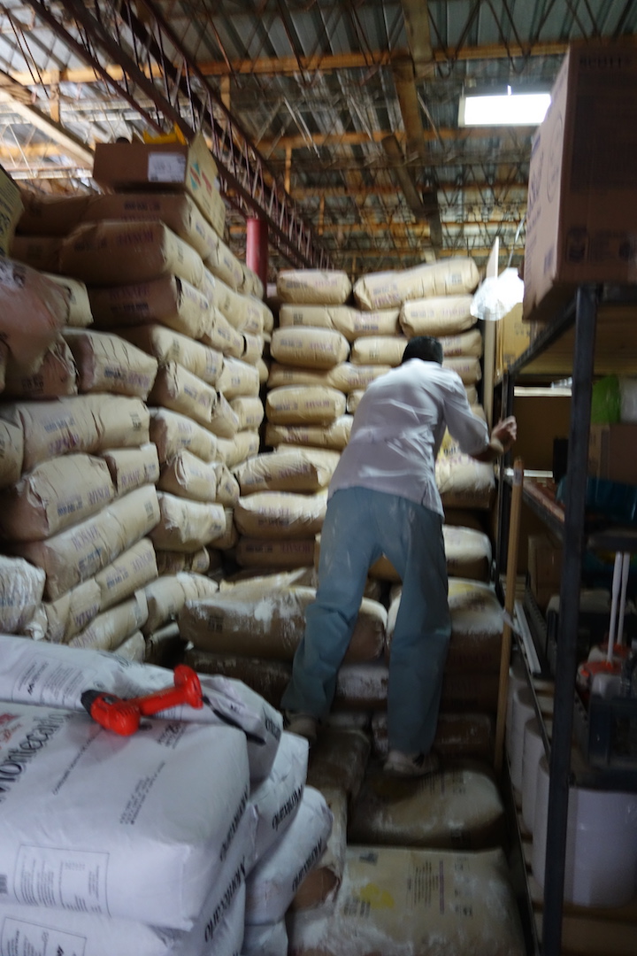 3 bunk beds, a small space with a toilet and shower squeezed in between bags of flour, shelves of eggs, butter and the baking ovens.