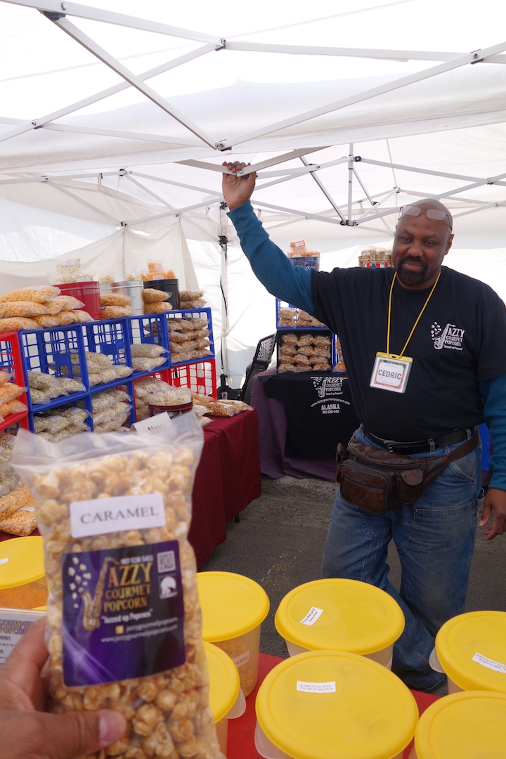 Cedric the popcorn guy at the Farmers market in Anchorage. Support and free popcorn!